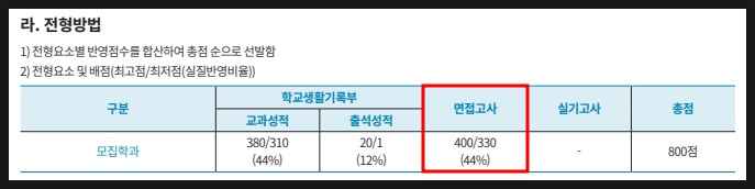 그리고 면접고사의 비중은 44%나 됩니다.